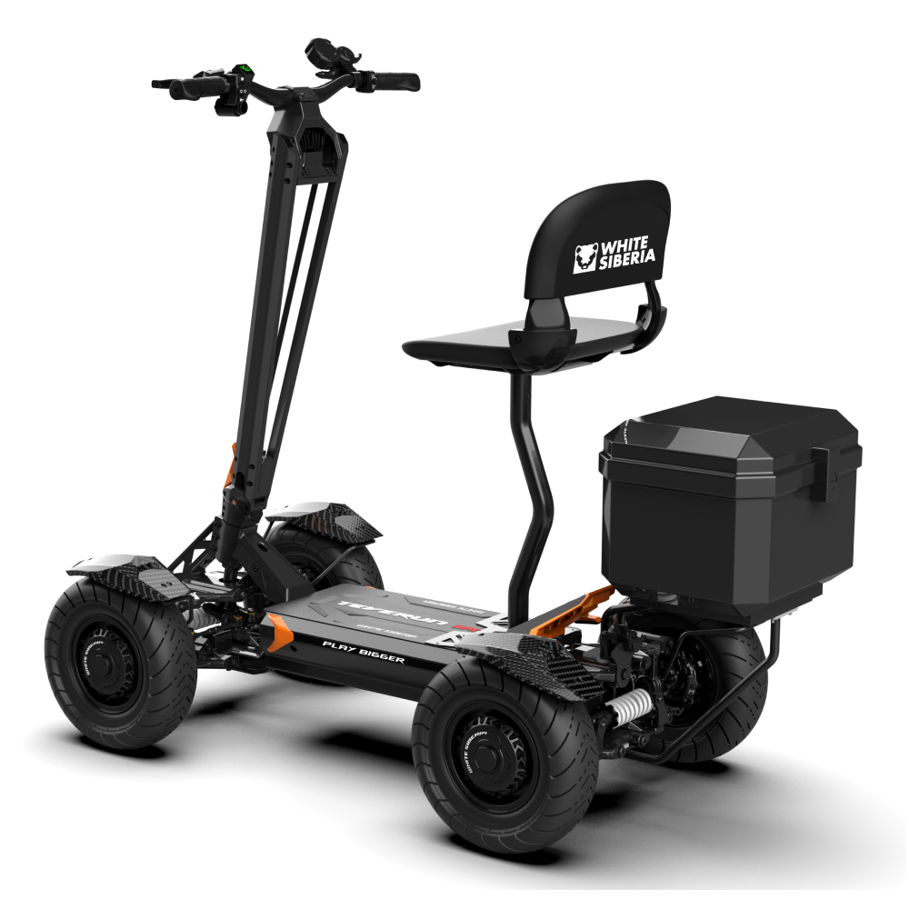 Электросамокат WHITE SIBERIA BANDIT 4x4 7200W оснащен четырьмя мотор-колесами по 1800W и способен развивать скорость до 65 км/ч, что делает его одним из самых быстрых в своем классе. На одном заряде аккумулятора 65Ah (72V) самокат проезжает до 100 км. Гидравлические дисковые тормоза гарантируют безопасность, а полная амортизация и карбоновые крылья добавляют устойчивости и стиля. WHITE SIBERIA BANDIT 4x4 7200W.