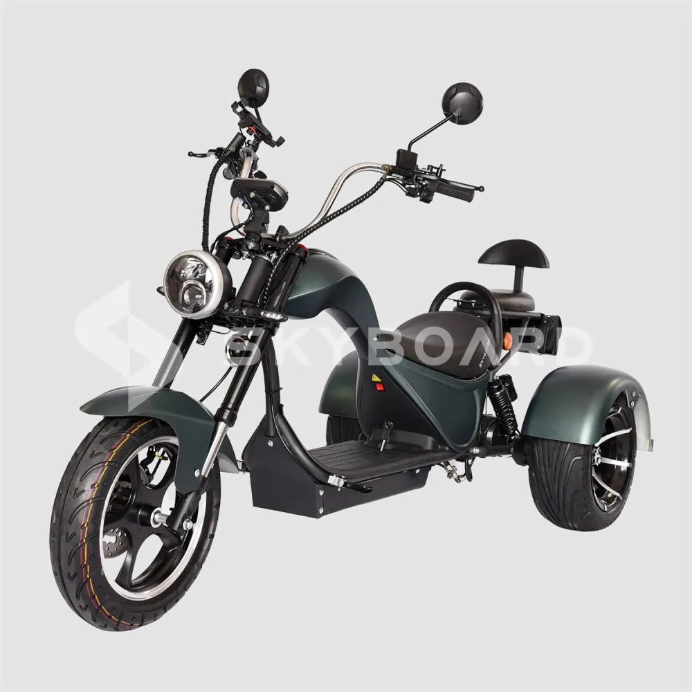 Электроскутер SKYBOARD TRIKE CHOPPER-4000 PRO FAST – мощный и эксклюзивный, первое, что приходит на ум при визуальном ознакомлении с техникой. Изогнутая рама, брутальный дизайн наталкивают на мысли о максимальных скоростях и непередаваемых ощущениях. Со слов производителя предчувствие клиентов является правильным.