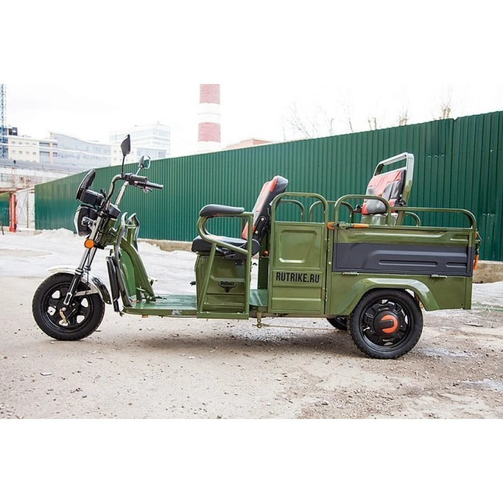 Груовой электротрицикл Rutrike Вояж-П 1200 Трансформер 60В 80 Вт  в зеленом цветовом оттенке - техника, предназначенная для лиц с активной жизненной позицией, жителей сельских районов, для которых отдых на свежем воздухе находится на первом месте. Электротрицикл грузоподъемностью до 400кг идеально подходит для вылазок с друзьями, езды на рыбалку и другие мероприятия на природе.