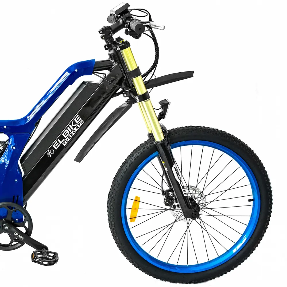 Электровелосипед Elbike TURBO R65 премиум класса представлен в благородном синем цвете. Мощный мотор 500 Вт, большой размер колёс в 26 дюймов, электровелосипед разгоняется до 40 км/ч.