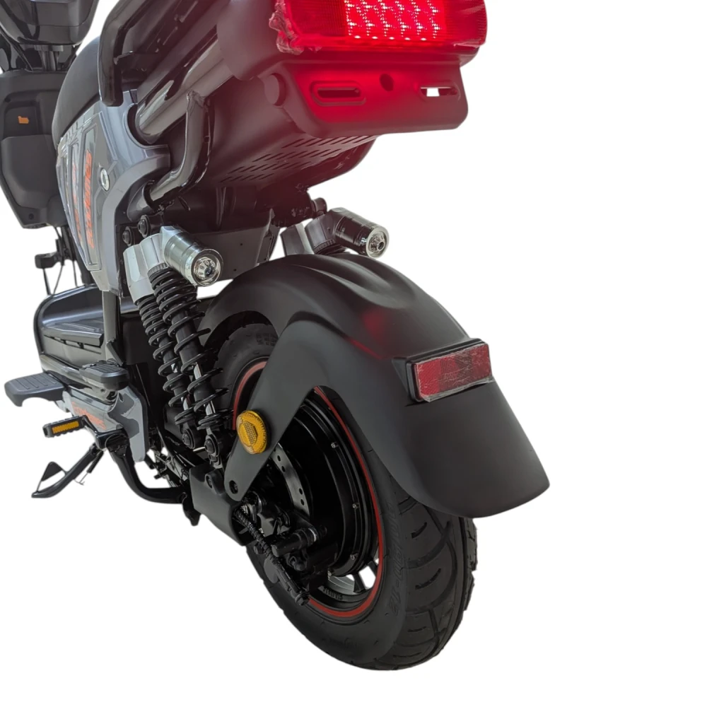 Гидравлические дисковые тормоза спереди и сзади обеспечивают короткое тормозной путь даже при скорости 60 км/ч и нагрузке 150 кг. Тормоза не требуют частой регулировки и эффективны во влажной погоде.
