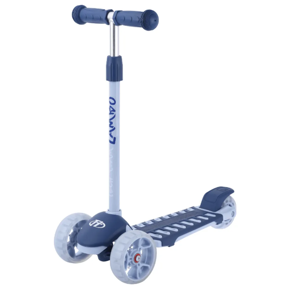 Самокат весом 2,1 кг рассчитан на максимальный вес в 35 кг. Изготовлен из безопасного прочного пластика, не имеет острых углов. Эргономичные компактные габариты не требуют выделения специального места в доме. Высота телескопического руля комфортна для ребенка, фиксируется в трех положениях в пределах 53-75 см.